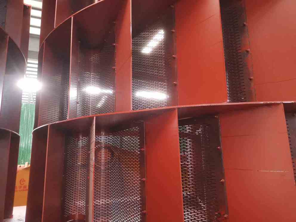 轮斗洗砂机经电动机、减速机的传动,驱动水槽中的叶轮不停地在水槽中作圆周性转动,从而将水槽中的砂石或矿渣颗粒物料在水中搅拌、翻转、淘洗,并使受水物料在叶轮中脱水后排出。