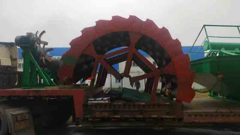 轮斗洗砂机经电动机、减速机的传动,驱动水槽中的叶轮不停地在水槽中作圆周性转动,从而将水槽中的砂石或矿渣颗粒物料在水中搅拌、翻转、淘洗,并使受水物料在叶轮中脱水后排出。