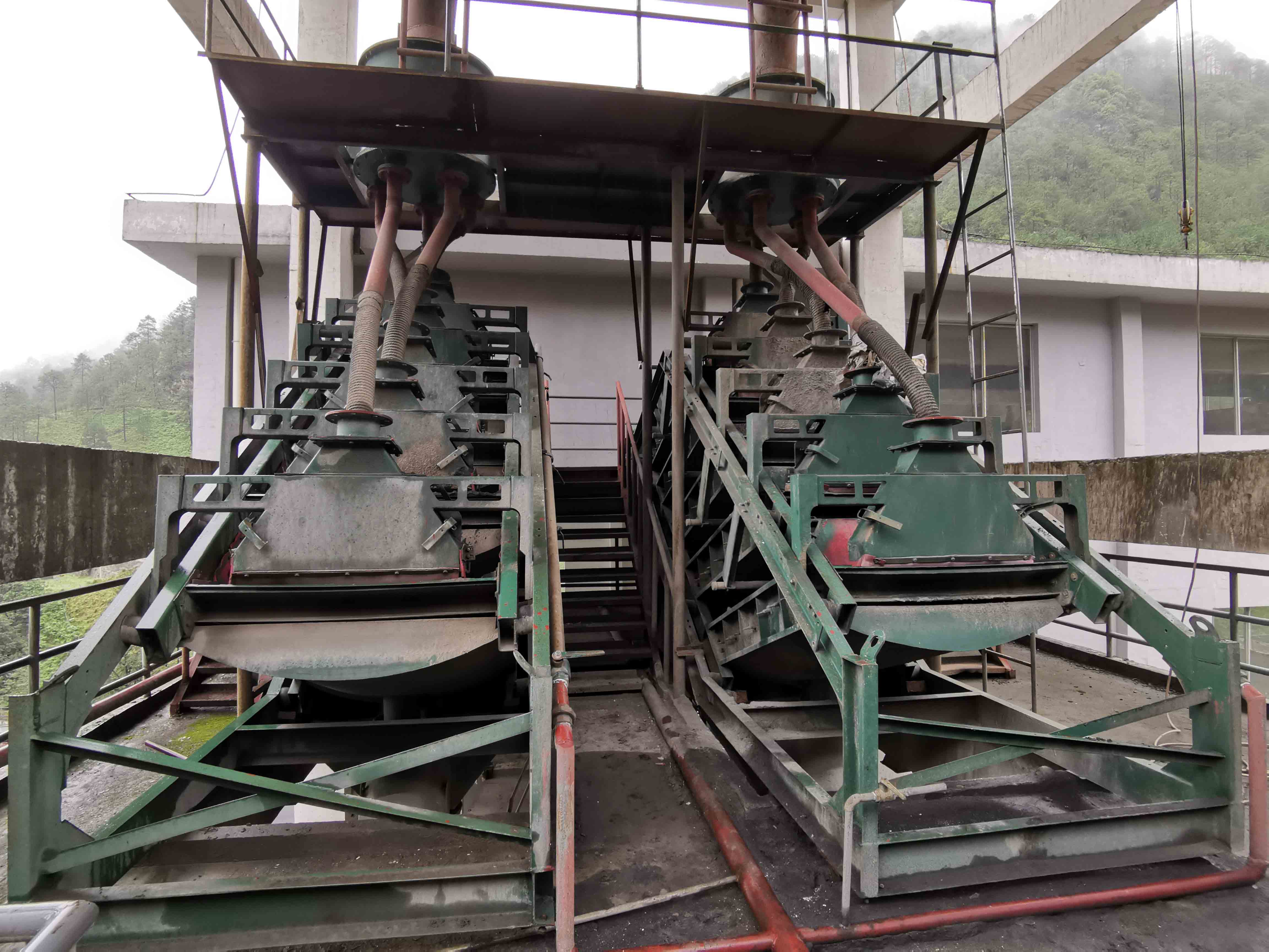 叠层高频振动细筛是由两台运动方向相反的电振动器带动筛框做直线运动,两台电振动器作用到筛框上的合力通过筛框的重心。因此筛框上各点的激振力大小一致。矿浆从分矿器上部或下部给入,经分矿器均匀分成多路,再经给矿软管分别进入多个给矿器。给矿器把矿浆均匀地洒在筛面上端。筛面上的物料由于连续受到高频率小振幅的振动,在倾斜的筛面上做作连续的跳跃,使物料分散,细粒物料在调匀的过程中透过筛孔称为筛下产品,而大于筛孔的物料在倾斜的筛面上作连续的向前跳跃,跳出筛网成为筛上产品。